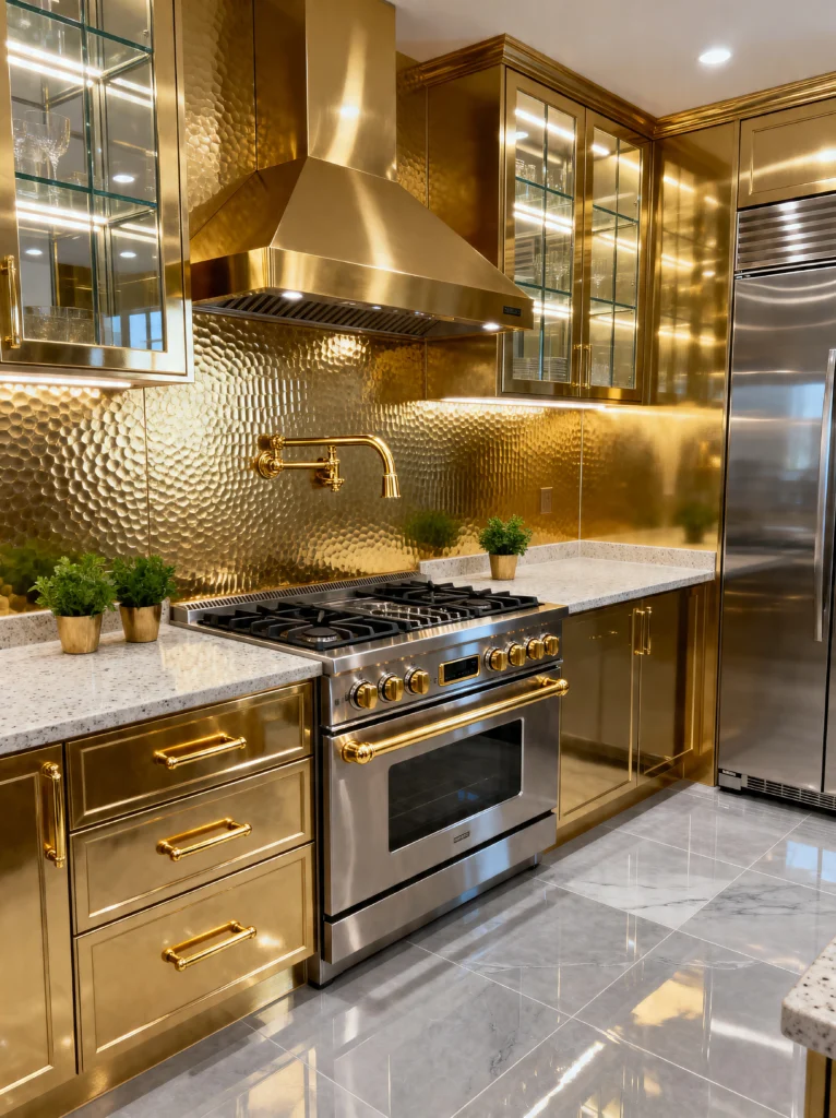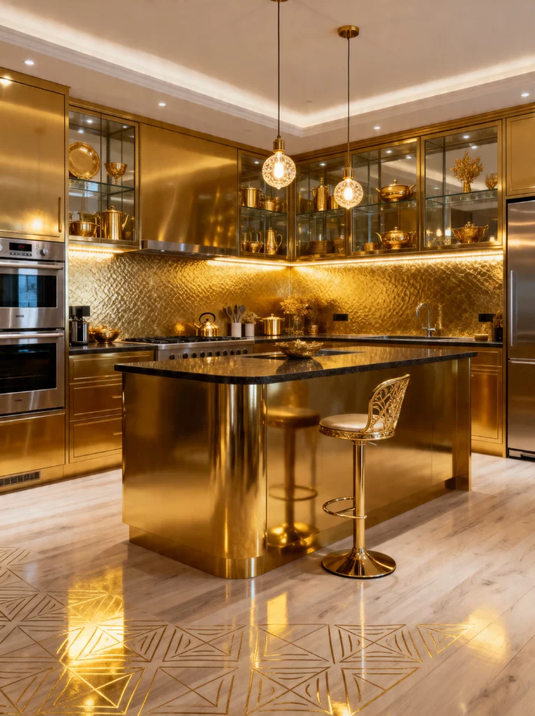 This kitchen is a masterclass in using different metal finishes together. You’ve got the high-shine gold cabinets paired with a stunning hammered gold backsplash that adds a ton of depth and “touchability” to the walls. It feels very industrial-chic, but if that industry was “billion-dollar jewelry making.”