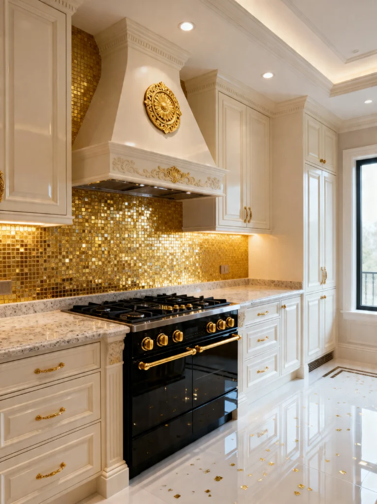 The backsplash is a shimmering mosaic of tiny gold tiles, which provides a nice textural break from the smooth, creamy white cabinets. Speaking of the cabinets, those gold bird-wing style handles are such a unique touch! Everything feels very intentional and “bespoke.” The black professional-grade range stands out as a focal point, grounding the light colors and making the kitchen look like it belongs to a world-class chef. And if you look closely at the floor, there are even tiny gold leaf accents scattered across the tile. It’s the kind of kitchen where you’d feel underdressed wearing pajamas—you almost want to put on a tuxedo just to make toast.