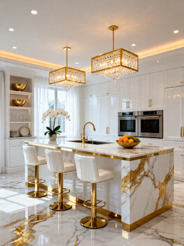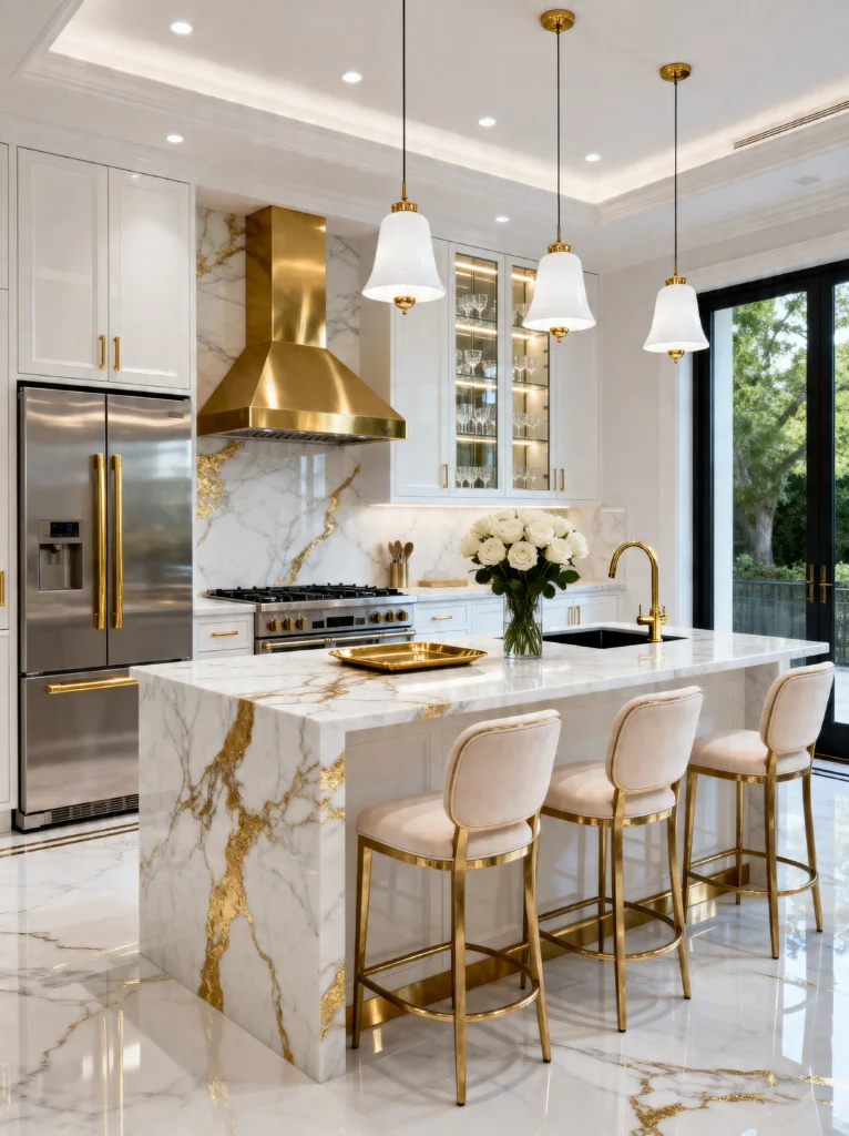 If the previous kitchens were about “power,” this one is about “peace.” It’s so bright and airy! This is a perfect example of how to do a white-and-gold kitchen without it feeling sterile. The “waterfall” marble island is a total showstopper—the way the gold veining wraps right down the side to the floor is just seamless and gorgeous.