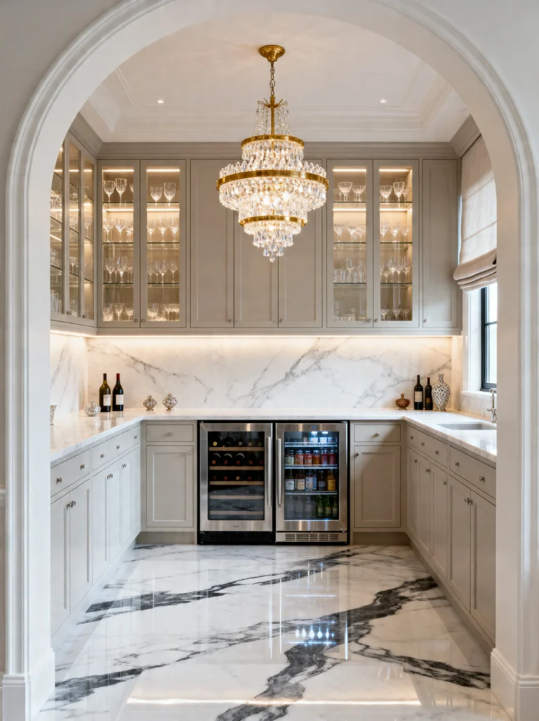 The white marble backsplash and counters keep things consistent with the rest of the house, and that massive crystal chandelier adds just enough “wow” factor to remind you where you are. This feels like the ultimate prep space. You can imagine tucking away here to get the drinks ready or organize the catering for a big event. The arched entryway frames the whole room like a picture, making a functional space feel like a destination. It’s proof that even the “utility” areas of a home deserve a bit of sparkle and a lot of style.