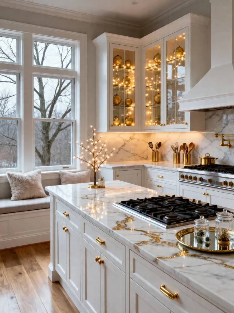 I love how this design plays with light. Those glass-front cabinets aren’t just for storing dishes; they’re a showcase. Filling them with golden ornaments and fairy lights is such a brilliant, simple way to transition a kitchen into the holiday season without cluttering the counters. And can we talk about that window seat? It’s the perfect little nook to curl up with a book while the snow falls outside. The mix of the natural wood floors with the high-end gold hardware keeps the room feeling grounded and inviting rather than cold. It’s the ultimate “Goldilocks” kitchen—not too modern, not too traditional, but just right. It feels like a place where you’d actually want to hang out all morning.