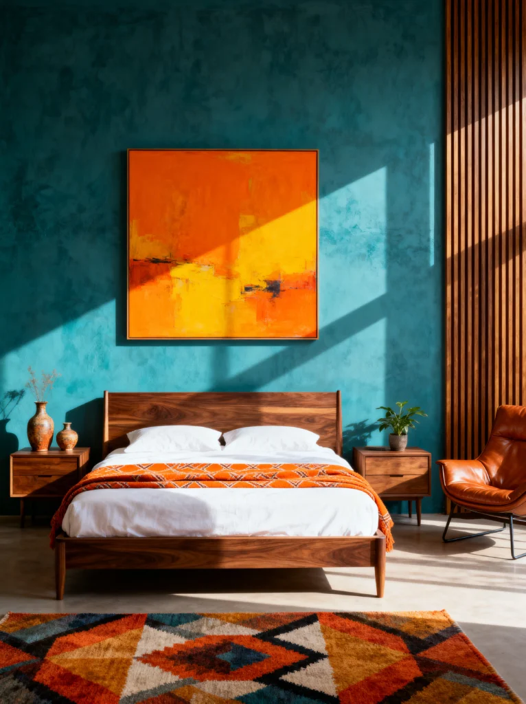 Slap-bang in the middle is that vibrant orange-to-yellow gradient art. It looks like a sunset trapped in a frame. By placing it against the teal, the colors literally vibrate—it’s high energy but balanced by the grounded, earthy tones of the walnut bed and nightstands. Speaking of the furniture, look at those tapered legs and the beautiful grain on the headboard. That’s MCM 101.