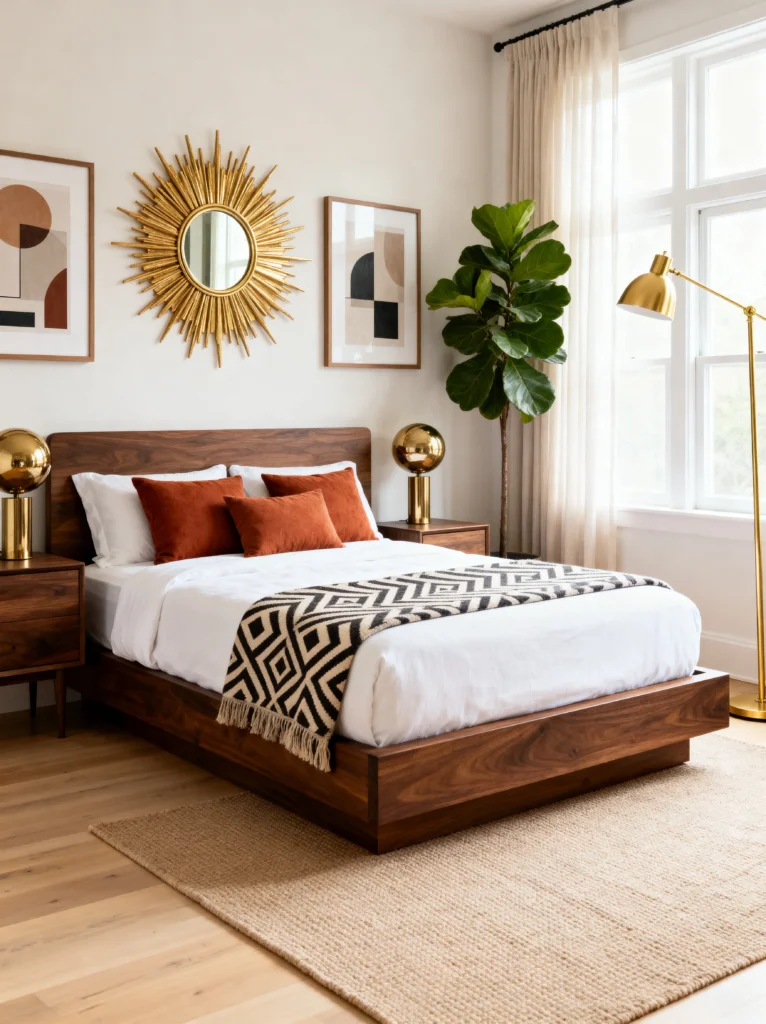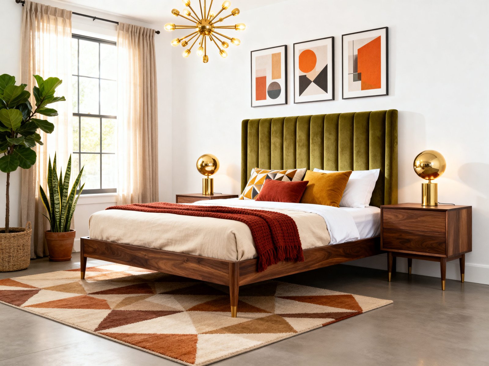 The “Sunburst” mirror in gold is a classic MCM icon, and it pops beautifully against the dark wood. The bedding is a quilted terracotta that looks rich and heavy, paired with olive green pillows. It’s a very “earth-toned” palette that feels grounded and serene.