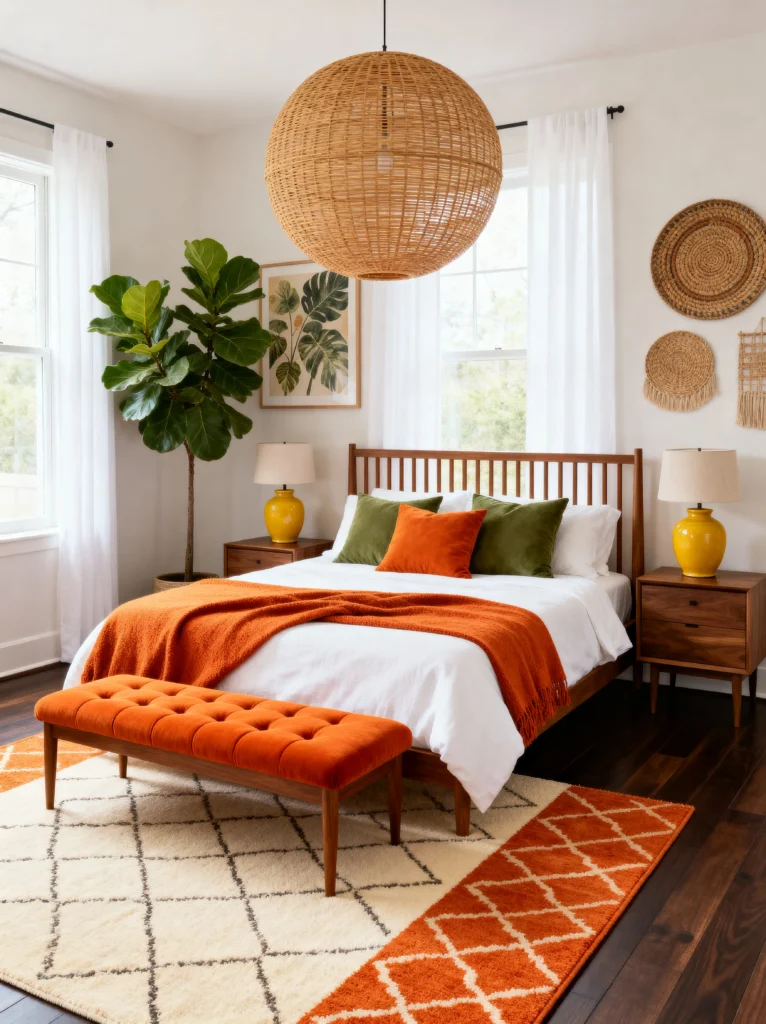 If you want your bedroom to feel like a permanent vacation, this is the blueprint. There is something so incredibly grounding about an orange and green color palette—it’s like bringing the best parts of a forest at sunset right into your home. The star of the show here is definitely that oversized rattan globe pendant. It draws the eye upward and adds a giant dose of natural texture that balances out the rich, dark wood flooring.