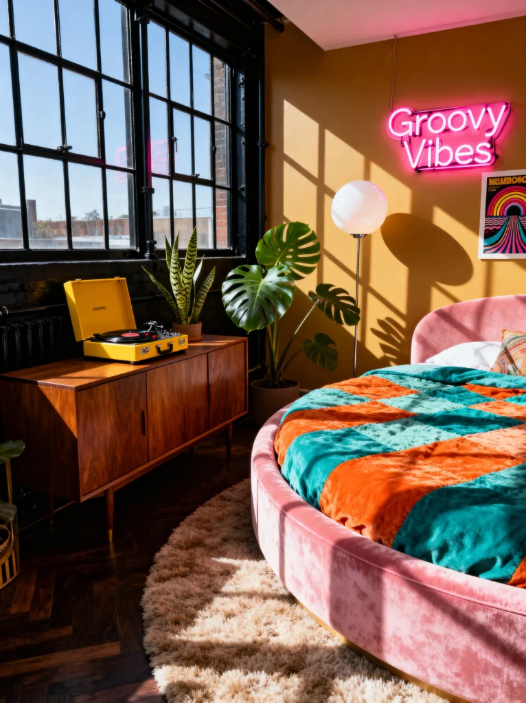This room is for the person who isn’t afraid to turn up the volume. We’re moving away from the quiet neutrals and diving straight into a “Groovy Vibes” wonderland. That pink neon sign is an absolute game-changer—it gives the room a nightlife energy even during the day. The round bed is a bold choice (and honestly, such a fun throwback to 70s lounge culture), especially when paired with that teal and orange checkered bedding.