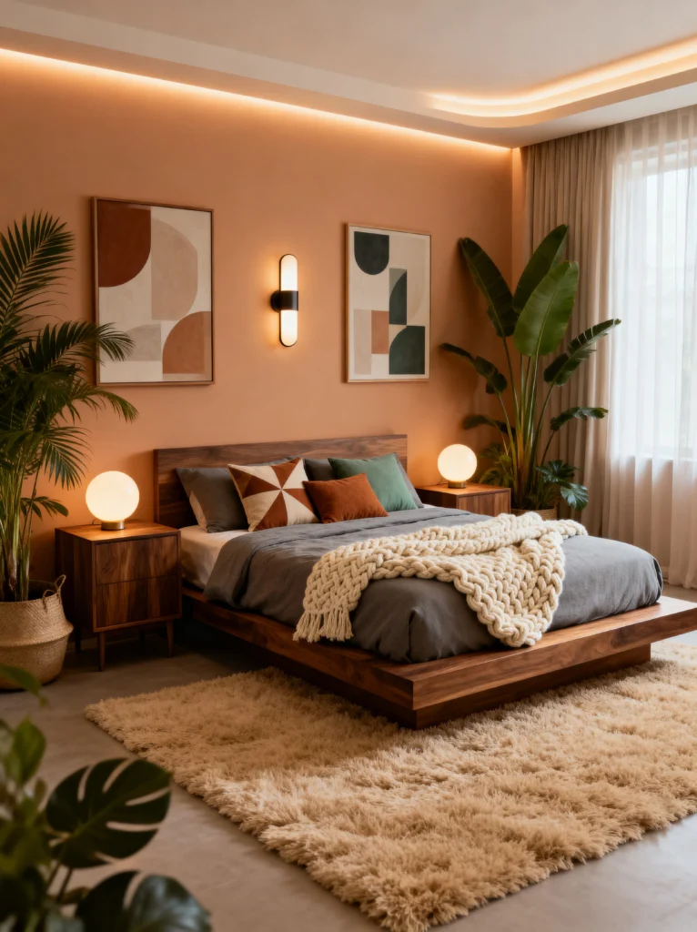 Is there anything more soothing than a room bathed in warm, amber light? This space feels like a giant hug. The monochromatic approach with the terracotta walls creates a seamless, wrap-around feeling that is instantly calming. The floating walnut bed frame gives the room a modern, high-end edge, while that chunky knit throw adds the “touchable” comfort every bedroom needs.