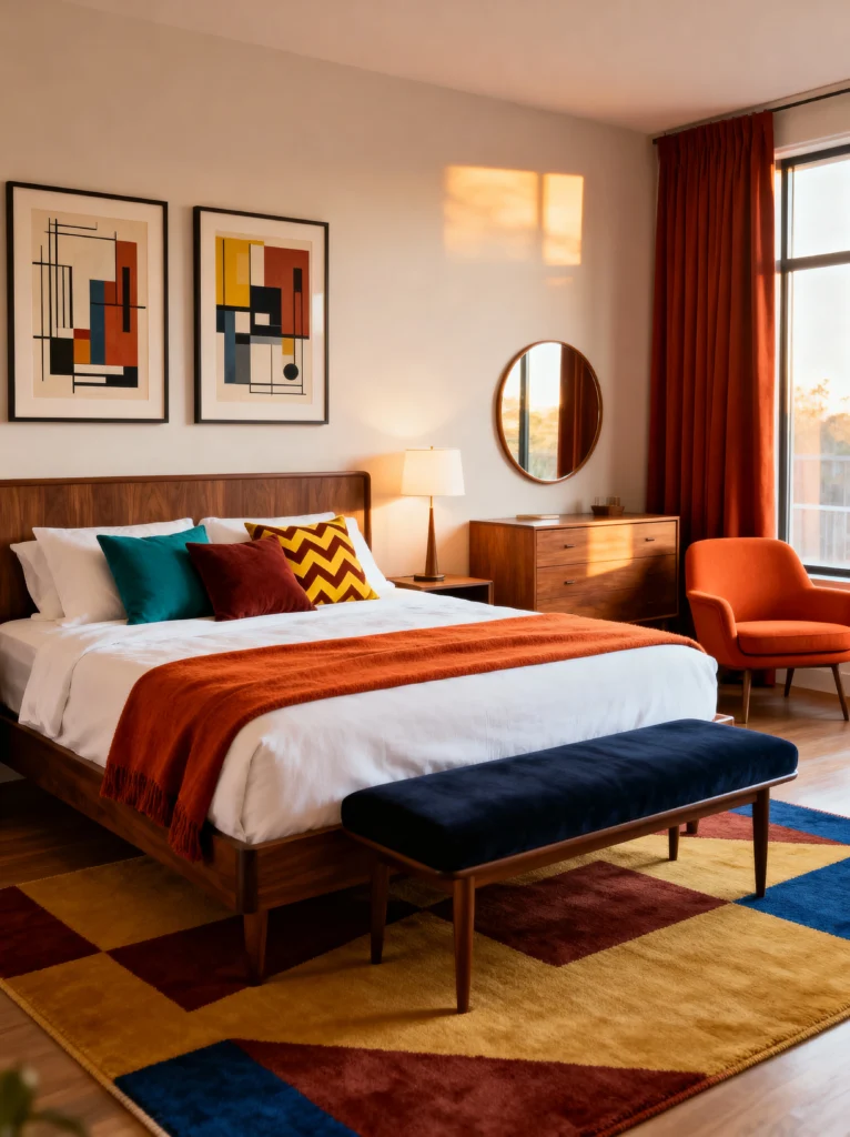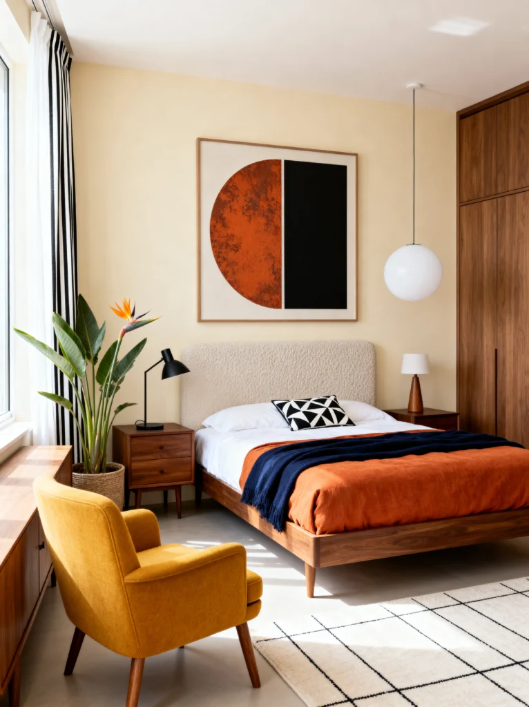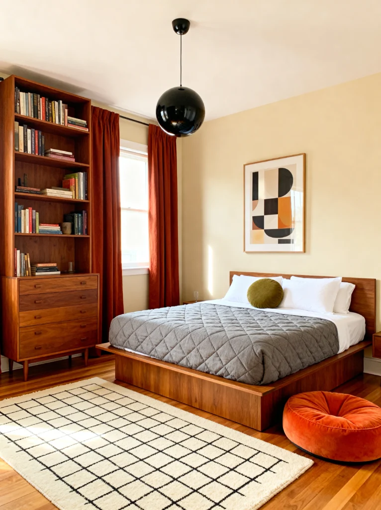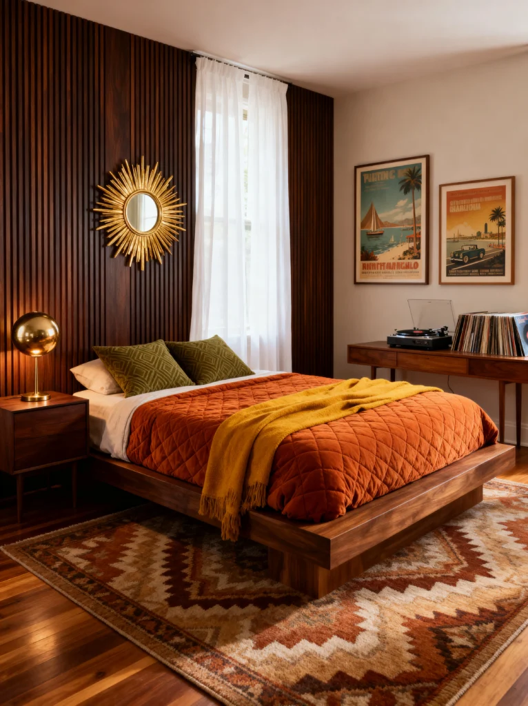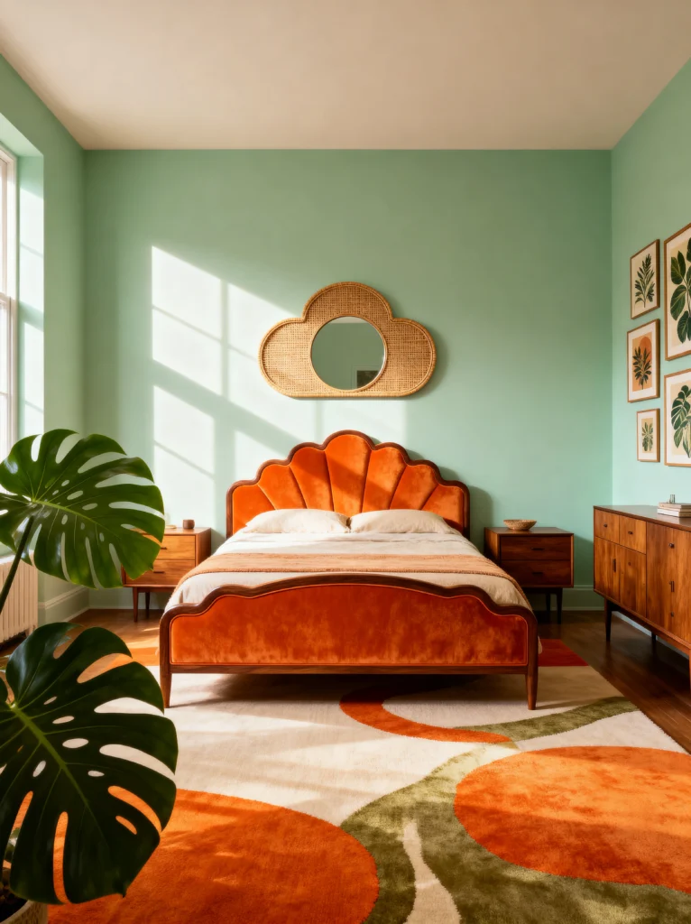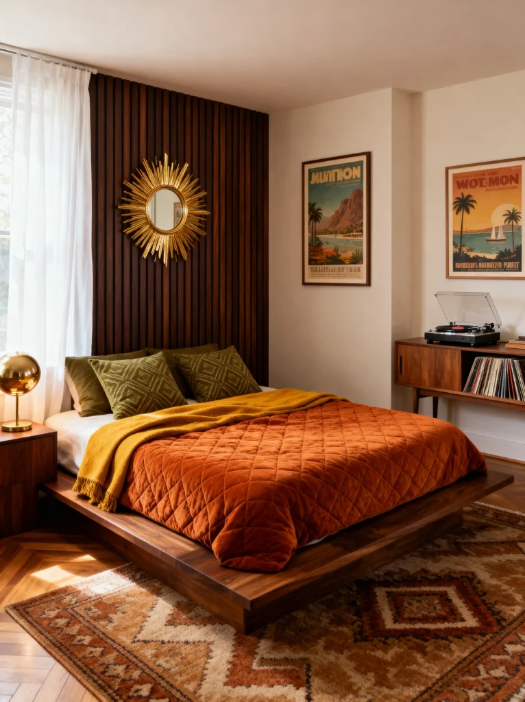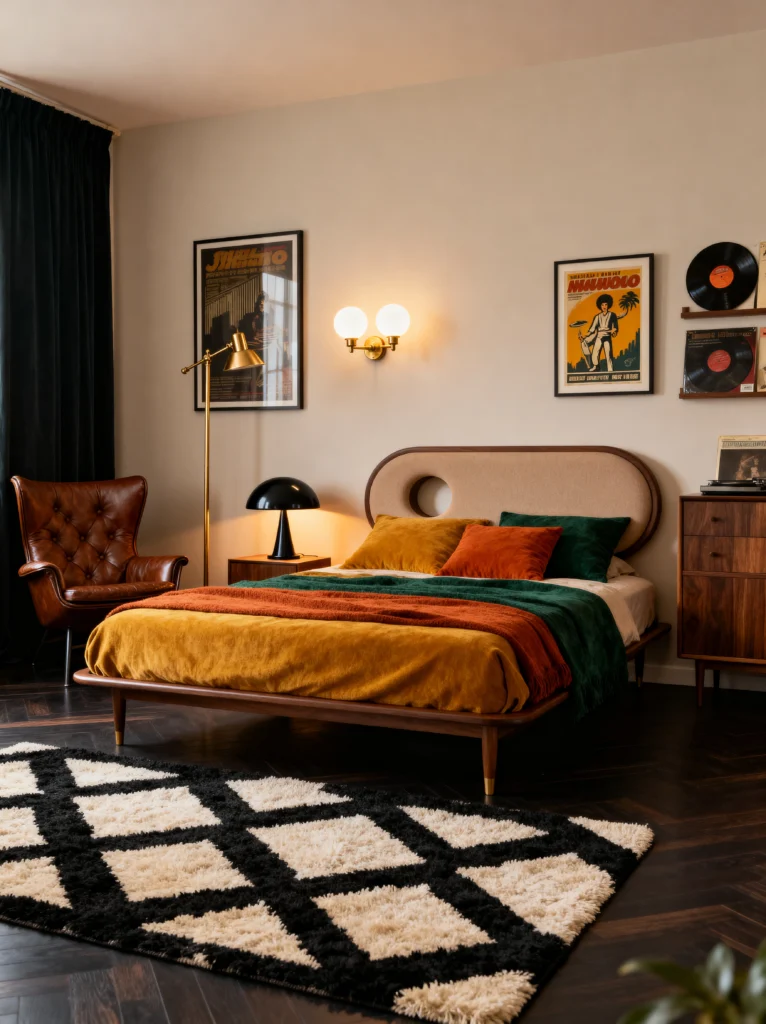 This is the “grown-up” version of retro. It’s sophisticated, curated, and feels like it belongs in a high-end boutique hotel. The color palette is wonderfully moody—dark forest greens, burnt oranges, and mustard yellows against a dark herringbone floor. The bed frame is a total work of art with that unique “peek-a-boo” hole in the headboard. It’s those little architectural details that make a piece of furniture feel special.
