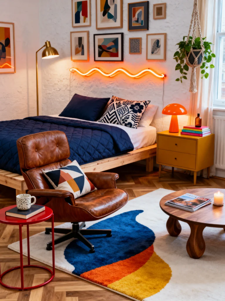 The furniture is a mix of icons—the Eames-style leather lounger, the mushroom lamp, and a low-profile wooden coffee table. This room proves that you can mix primary blues, oranges, and yellows without it looking like a playroom. The key is in the balance; the neutral wood tones of the bed and floor ground the vibrant blue quilt and the “teardrop” rug. It’s a space that celebrates creativity and doesn’t take itself too seriously.