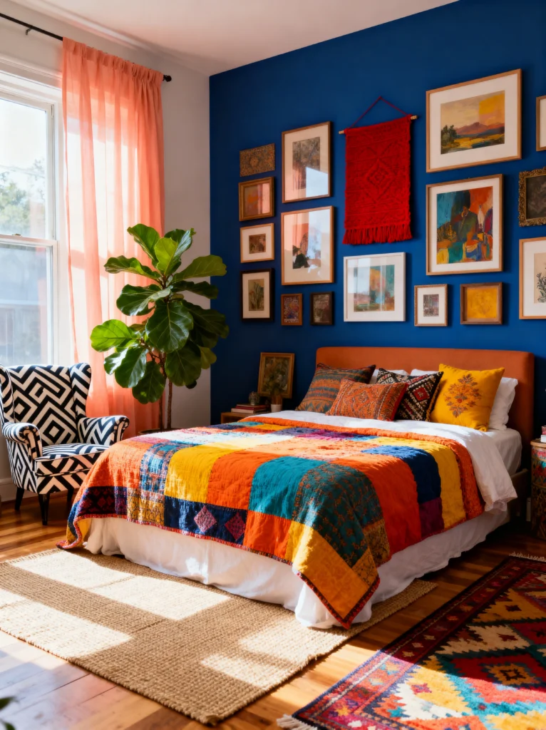 Blue and orange are complementary colors on the wheel, which is why this room feels so vibrant and “alive.” The deep cobalt blue accent wall is a daring choice, but it works because the room is flooded with natural light from that large window. The coral-toned curtains soften the light and add a beautiful glow to the space.