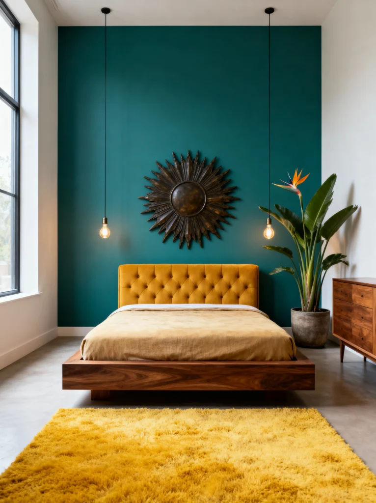 By keeping the rest of the room relatively minimal—the platform bed, the simple pendant lights, and the concrete-style flooring—the focus stays exactly where it should. The yellow tufted headboard and matching shaggy rug provide a “sunny” contrast that prevents the teal from feeling too cold or heavy. The Bird of Paradise plant in the corner adds a touch of organic drama. It’s a clean, modern take on retro-inspired colors that feels incredibly high-end and spacious.