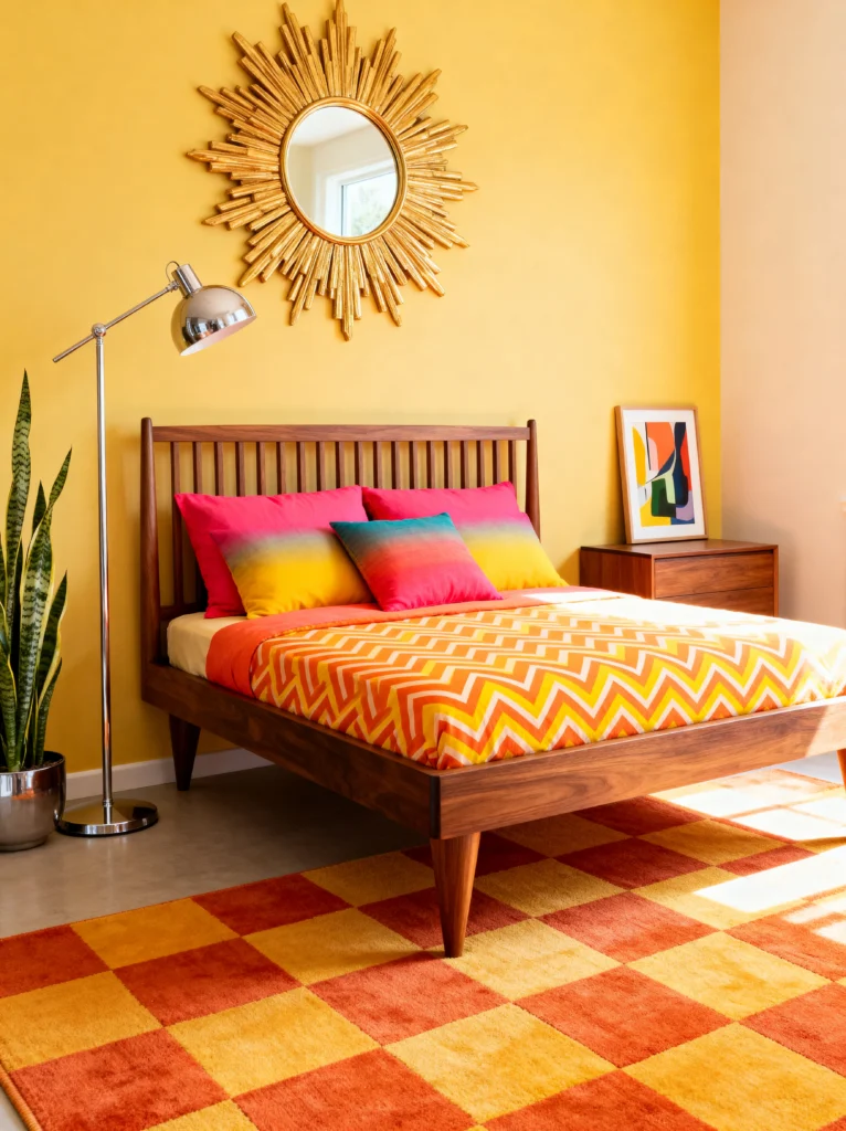 The room is tied together by the large checkered rug, which adds a playful, graphic element to the floor. The classic sunburst mirror makes another appearance here, proving it’s the ultimate accessory for this aesthetic. The silver floor lamp and the snake plant add a bit of “cool” to balance out all those warm tones. This is a room that would be impossible to wake up in and feel anything but happy. It’s bright, energetic, and full of personality.