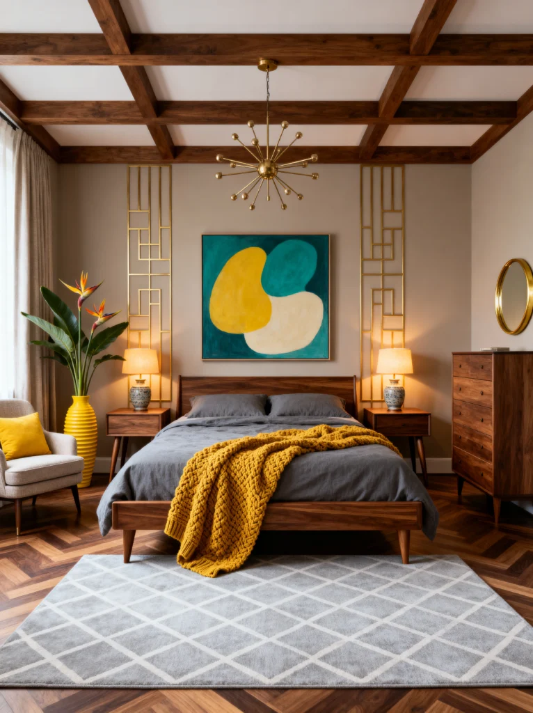 The bed setup here is super inviting. The charcoal grey bedding is the perfect backdrop for that chunky, mustard-yellow knit throw. It looks so soft you just want to dive in. Behind the bed, we’ve got these gold geometric wall panels that flank the artwork. They add a bit of “Art Deco” flair to the Mid-Century base, which is a great way to mix styles.