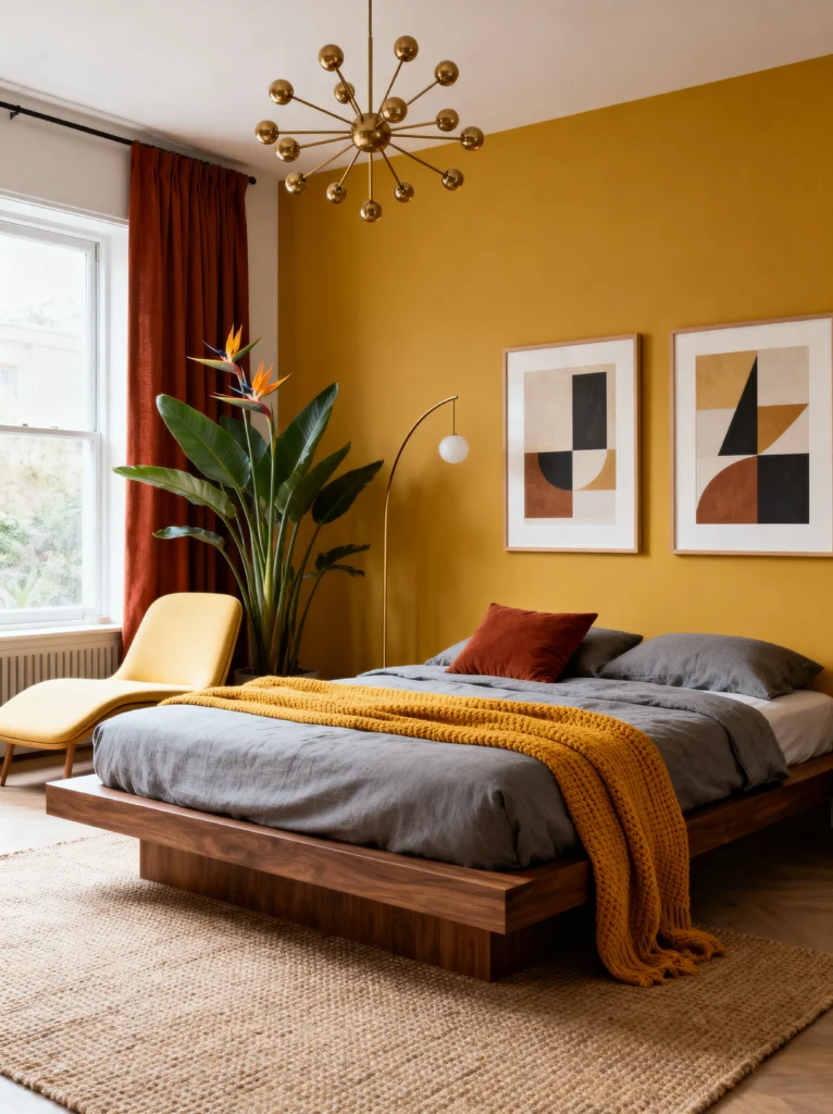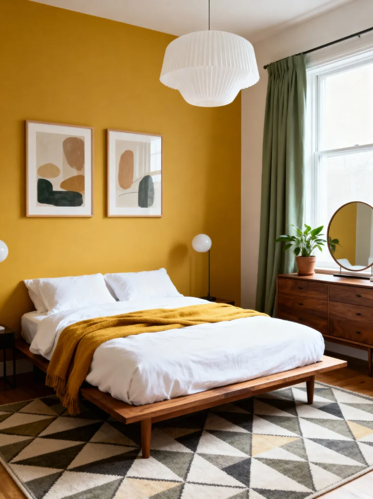 This room is pure sunshine. That mustard-yellow accent wall is such a bold choice, but man, does it pay off. It creates this warm, golden glow that probably makes waking up on a rainy Monday feel a lot less miserable.