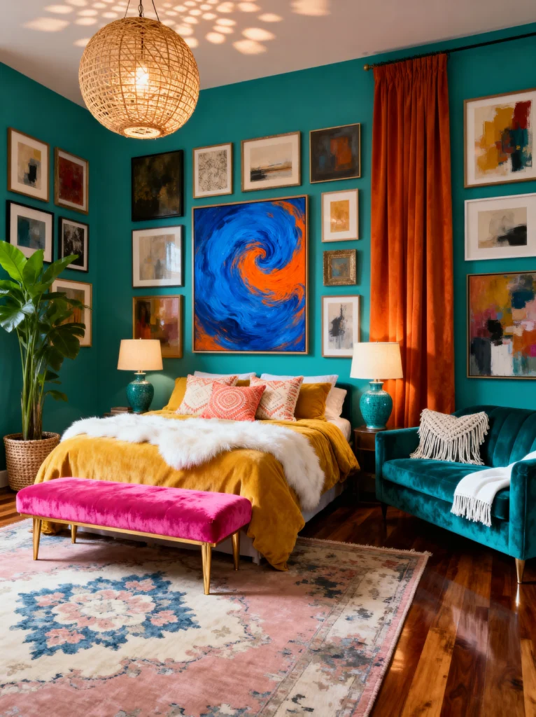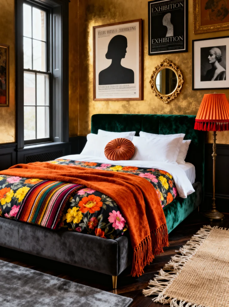 What makes this work without being “too much” is the contrast. You’ve got that deep, emerald green velvet bed frame that grounds the room, paired with an explosion of orange and floral patterns. It’s a very sophisticated take on the “Boho” look—let’s call it “Moody Luxe.” The gallery wall is also a masterclass in curation; notice how the black-and-white prints give your eyes a place to rest amidst all that shimmering gold.