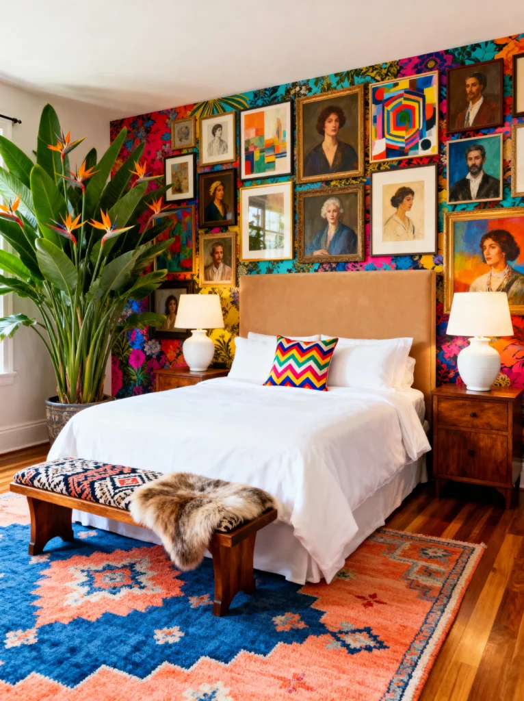 There’s something so sophisticated about mixing old-world portraits with such a wild, tropical background. It feels like a room in a hidden boutique hotel in London or Paris. The velvet headboard in that warm tan shade is a genius move here—it’s tall and commanding, but the neutral color helps ground all the busy patterns happening behind it.