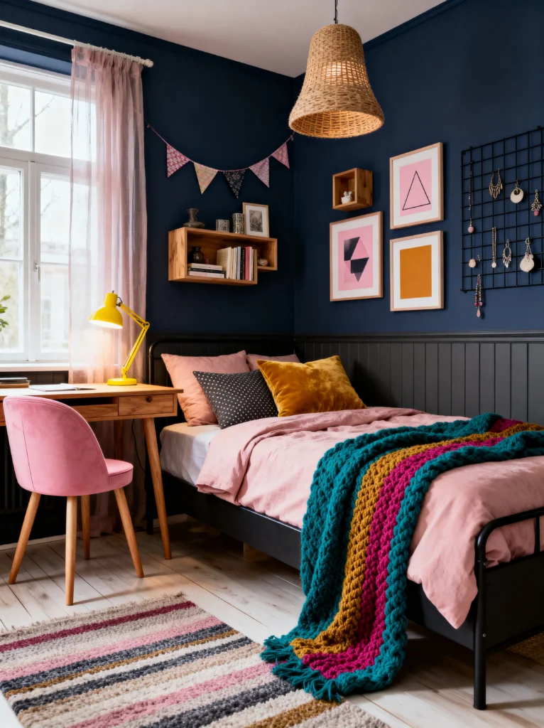 The knit throw blanket on the bed is the real MVP of texture here. Those thick, chunky stripes of teal, mustard, and magenta add so much weight and comfort to the look. It makes you want to dive right in. And don’t miss the little bunting hanging in the corner—it adds a touch of whimsy that keeps the dark walls from feeling too serious. This is a room that feels curated but still totally relaxed and “you.”