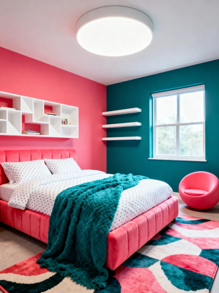 This room is for the people who aren’t afraid to live out loud! It is pure energy. The color blocking with that hot pink and deep teal is so modern and daring. It’s like a 3D art piece you can actually sleep in. The pink velvet bed frame is such a statement—it’s soft, it’s plush, and that color is just incredible.