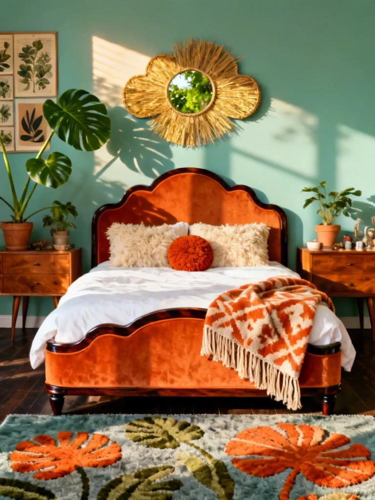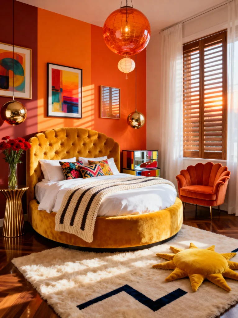 Is it just me, or does this room feel like a warm hug at golden hour? The palette of oranges, yellows, and deep reds is so incredibly inviting. It feels like autumn all year round, but in a very chic, “70s-glam” way. That round, mustard-yellow velvet bed is everything. The tufting adds so much texture, and the shape is just so unique.