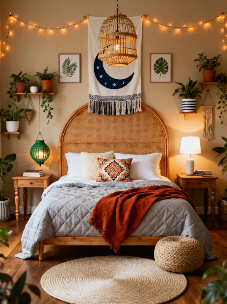 For anyone who loves a bit of a natural, earthy vibe, this room is the dream. It’s got that “Boho-Chic” look down to a science. The rattan headboard is the centerpiece, and it brings so much warmth and organic texture to the space. Paired with the moon tapestry hanging above it, it feels very peaceful and grounded.
