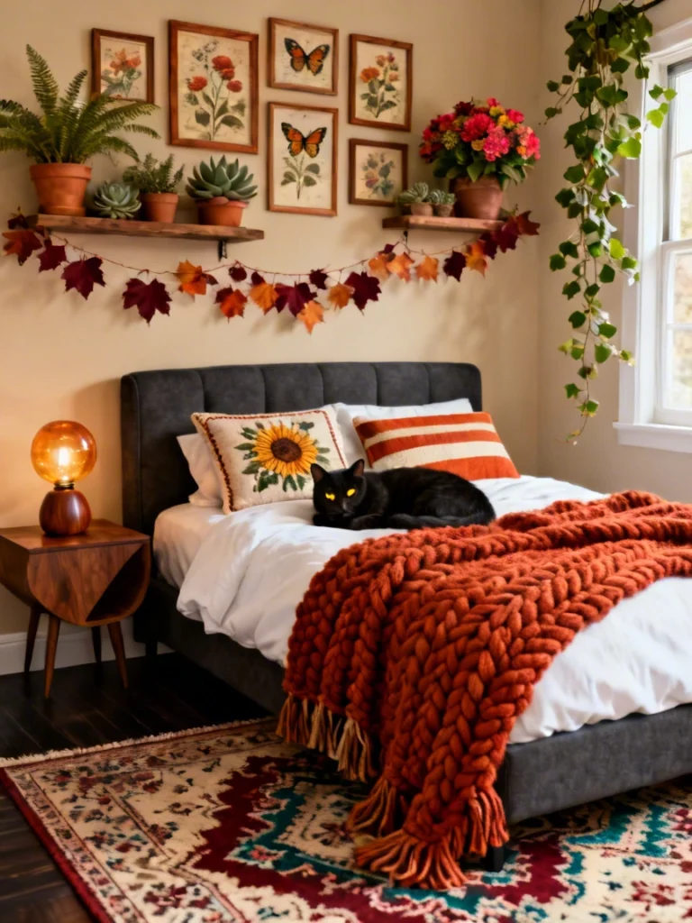The botanical prints on the wall are a lovely way to bring a bit of nature indoors. I love how they’re arranged in a little cluster, surrounded by real plants and a garland of autumn leaves. It’s very “cottagecore” but with a slightly more modern, polished edge. The dark grey upholstered headboard provides a nice, solid backdrop for the sunflower pillow and the striped accents.