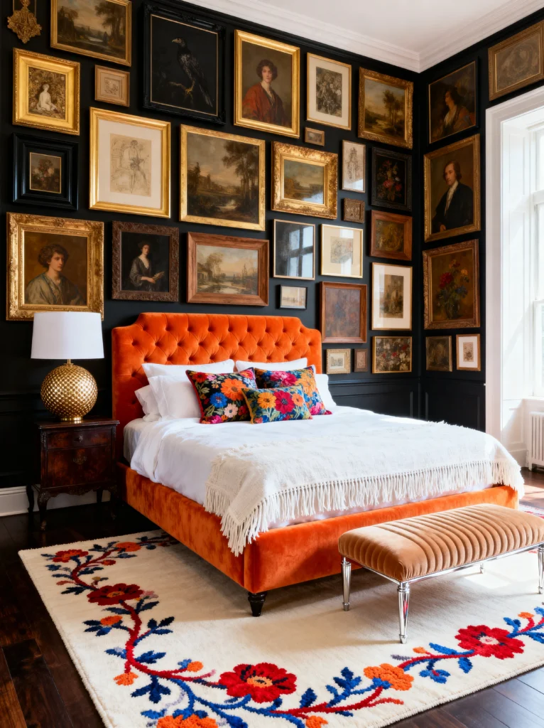 If you want to feel like royalty, this is the room for you. This is “Dark Academia” meets “High Luxury.” The black walls are such a bold, dramatic choice, and they make those gold-framed paintings absolutely pop. It’s like having your own private gallery right in your bedroom. The sheer volume of frames is what makes it work—it’s unapologetically maximalist.