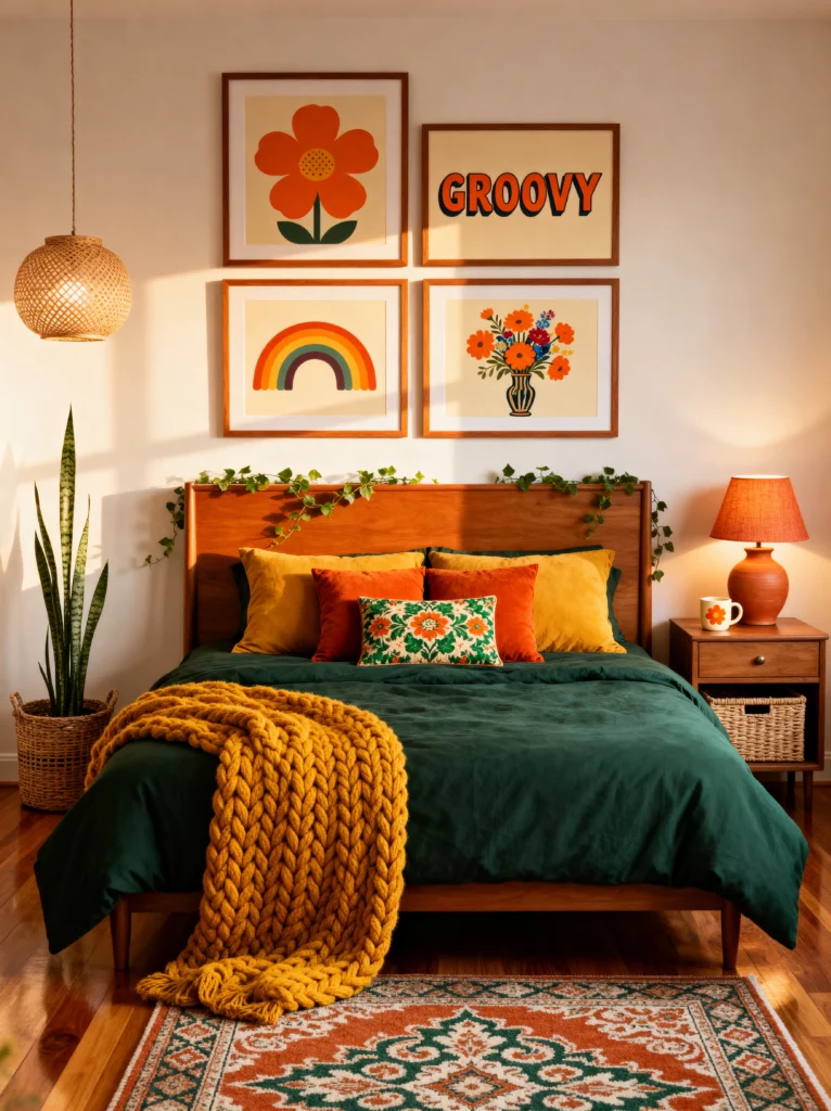 The color palette of forest green, burnt orange, and mustard yellow is the ultimate retro trifecta. That dark green bedding is so rich and looks amazing against the warm wood of the headboard. And of course, we have another one of those incredible chunky knit throws—this time in a bright mustard yellow.