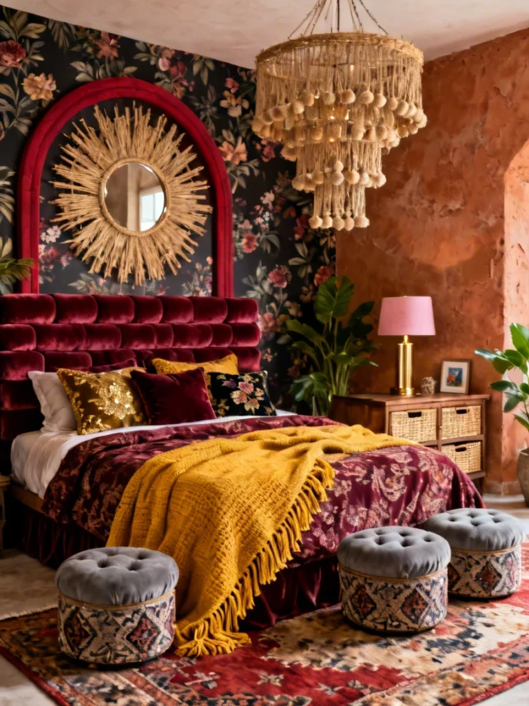 The backdrop is a moody floral wallpaper that ties the reds of the bed to the earthy, terracotta tones of the side wall. I love the use of natural textures to balance out the “heavy” velvet—that straw-colored sunburst mirror and the massive tiered fringe chandelier bring in a rustic, organic element that keeps the room feeling breezy rather than stuffy.