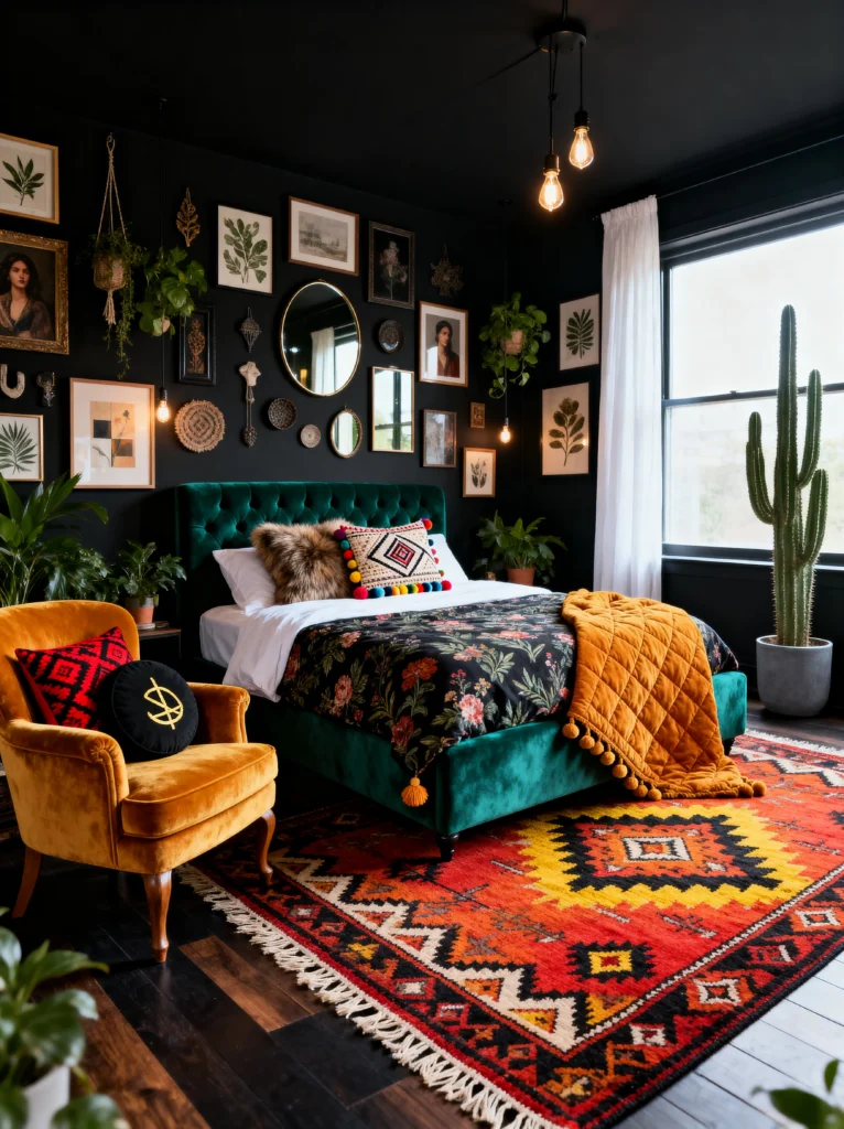 The emerald green velvet bed returns here, but this time it’s paired with a high-contrast, geometric rug that pulls in vibrant oranges and yellows. This is “Urban Jungle” meets “Mid-Century Modern.” The gallery wall is perfectly chaotic in the best way possible—mixing botanical prints, mirrors, and small sculptures.