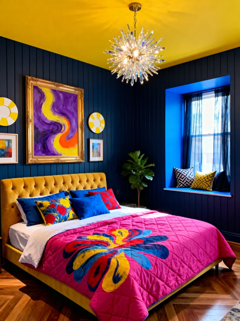 Okay, this room is for the bold. We’re talking high-voltage color saturation! The deep navy wood-paneled walls against that bright yellow ceiling? Inspired. It’s a daring move that pays off because it creates a cozy, “enveloped” feeling.
