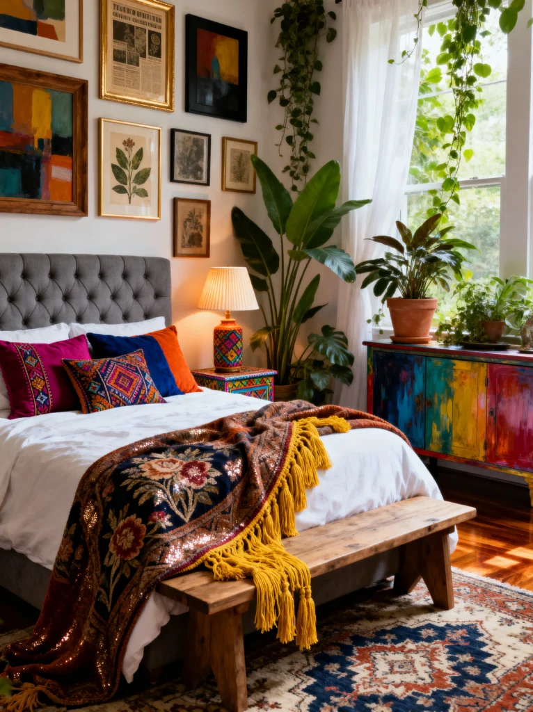 This room feels like it belongs to a painter. It’s bright and white, but every inch is filled with color through decor and textiles. The tufted grey headboard is a neutral base, allowing the vibrant, embroidered pillows and the stunning sequined floral throw to do the heavy lifting.