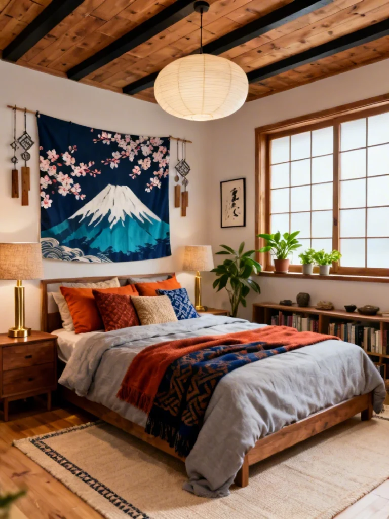 This is a beautiful example of “Japandi” (Japanese + Scandinavian) style but with a cozy, maximalist twist. The clean lines of the wooden bed frame and the shoji-style window screens provide a sense of order, while the large Mount Fuji tapestry brings in drama and color.