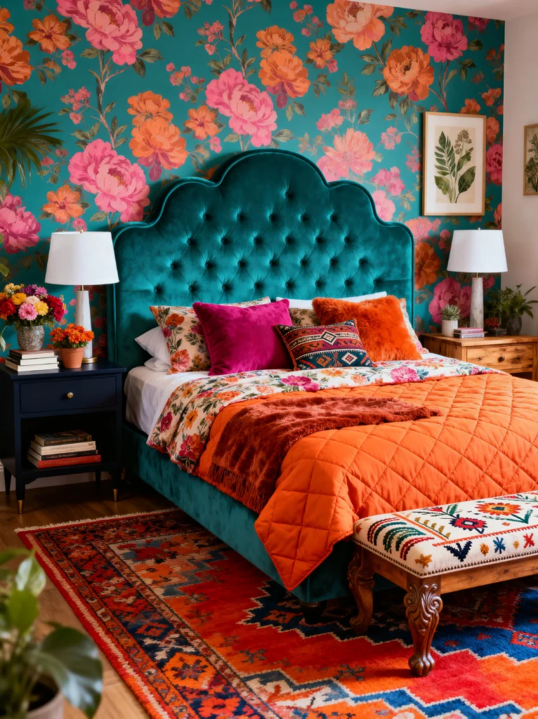The scalloped, tufted headboard in emerald green is the perfect partner for the wallpaper. It mimics the shapes of the leaves and petals. Then, you have the bright orange quilted bedding which provides a sharp, energetic contrast to the cool tones of the bed.