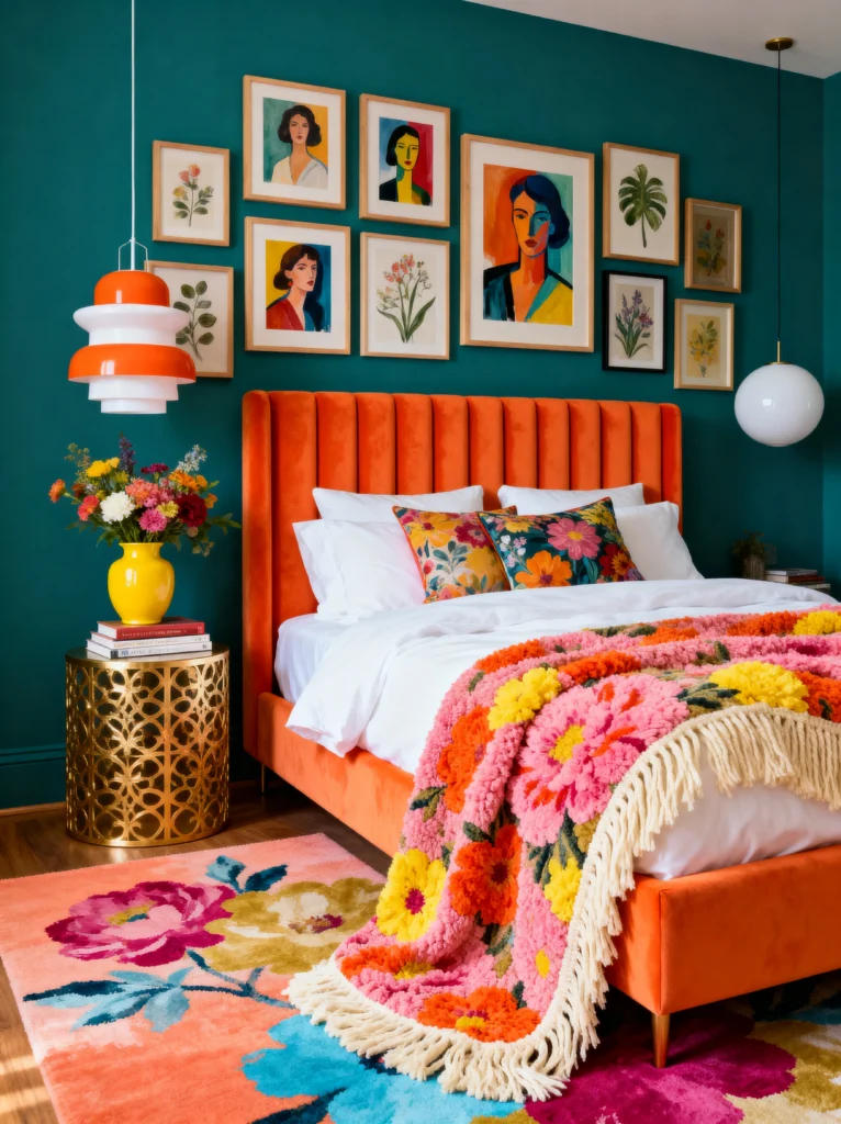 The orange velvet tufted headboard is tall and commanding, giving the bed a sense of importance. I also love the mismatched lighting—the yellow base lamp on the left and the orange “honeycomb” pendants hanging from the ceiling. The teal shaggy rug adds a final layer of fun texture. This room doesn’t take itself too seriously, and that’s exactly why it works. It’s cheerful, energetic, and undeniably stylish.
