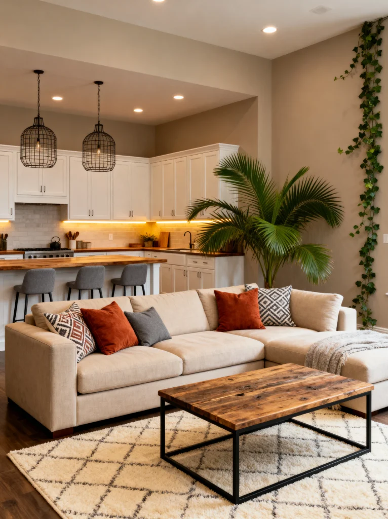 The living area transitions so smoothly because of the color palette. We’ve got those burnt orange and charcoal pillows that just pop against the creamy sectional. And can we talk about the greenery? That massive palm in the corner and the ivy trailing down the wall bring so much life inside. It’s the perfect balance of modern “clean” and “lived-in” cozy.
