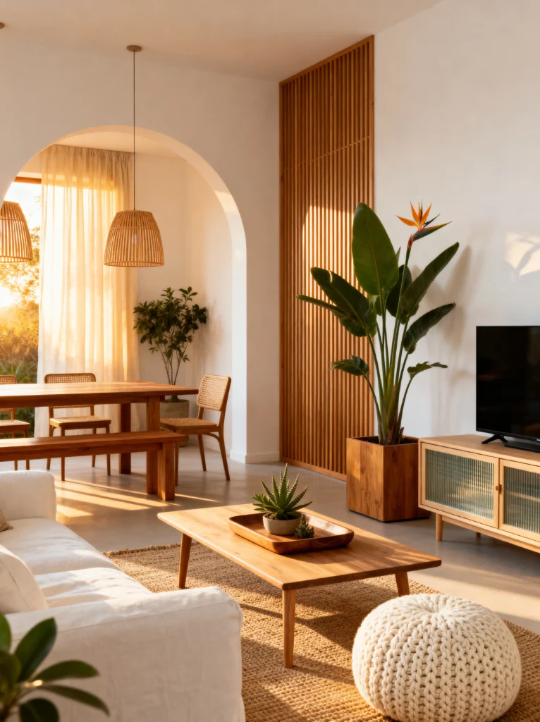 By keeping the palette super light—creams, soft whites, and light oak woods—the room feels incredibly spacious. To keep it from looking too “sterile,” there’s plenty of natural greenery. That tall Bird of Paradise plant in the corner adds just the right amount of drama and height. My favorite detail, though, has to be the slatted wood wall paneling. It adds a bit of rhythm and texture to an otherwise plain wall. It’s the kind of room where the sunlight is the best accessory. It’s clean, it’s intentional, and it feels like a high-end resort right in the middle of a house.