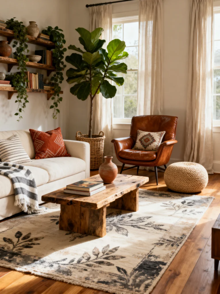 There’s something about a “lived-in” room that just feels so much more authentic, right? This space hits that sweet spot between rustic and refined. The coffee table is a total standout—it’s a chunky, live-edge piece of wood that looks like it has a hundred stories to tell. It’s imperfect, and that’s exactly why it’s perfect.