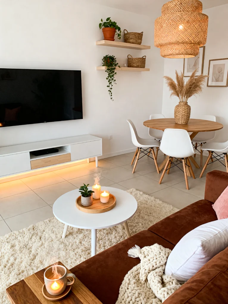 To keep a white room from feeling cold, you have to lean into the “hygge” elements. Look at that super shaggy rug and the chunky knit throw blanket on the sofa. It immediately softens the hard lines of the furniture. I’m also obsessed with the lighting here—there’s an LED strip under the console giving off a warm glow, and that layered wicker pendant over the dining table brings in that essential natural texture. It’s a great reminder that you don’t need a massive house to have a space that feels curated and stylish.