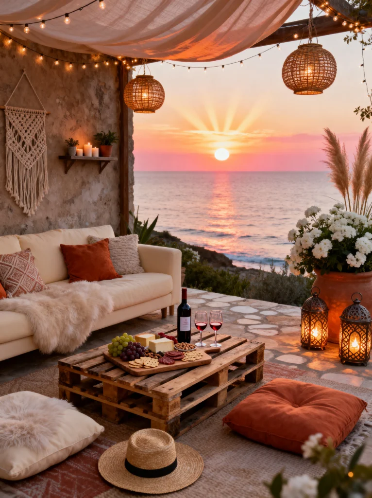 The textiles are key here—lots of faux fur, macramé wall hangings, and plush pillows make an outdoor stone patio feel as comfortable as a living room. But the real magic happens with the lighting. Between the string lights overhead, the woven lanterns, and the candles on the shelves, the whole place just glows as the sun goes down. It’s the perfect spot for a wine and cheese night. It’s not just a patio; it’s an experience.