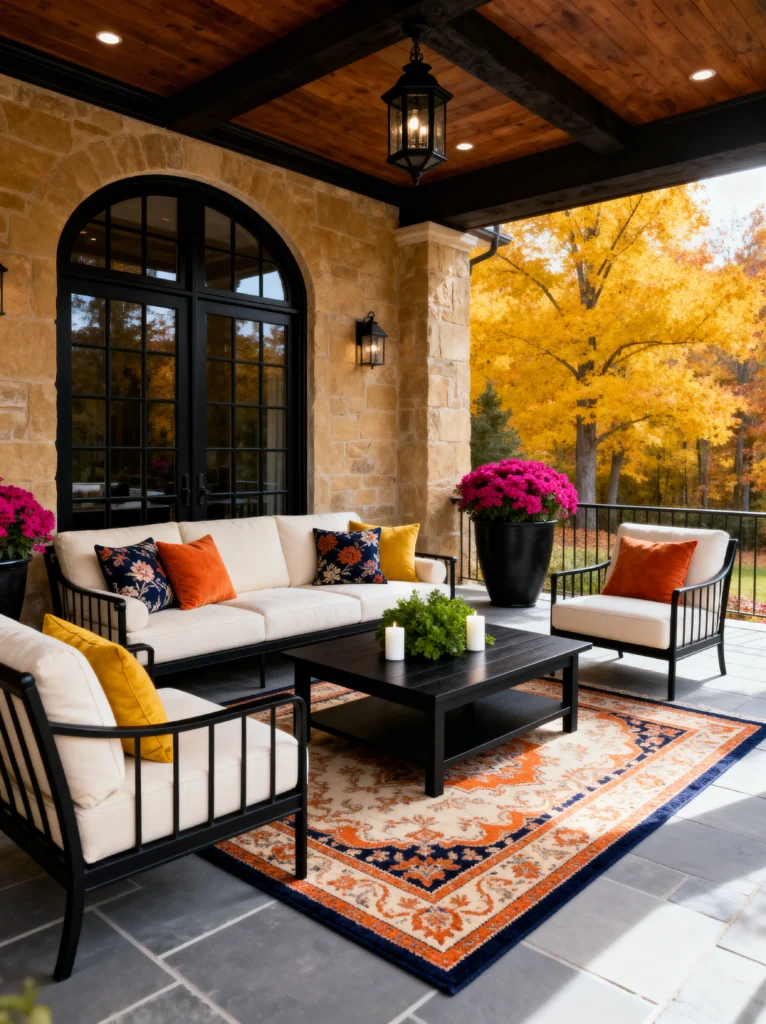 What I love most is how the colors of the decor mimic the trees in the background. Those burnt orange and mustard yellow pillows are a direct nod to the fall foliage. It makes the whole transition from the house to the yard feel seamless. And adding those pops of bright pink mums in the large planters? Such a great way to add a bit of unexpected color. It’s sophisticated, cozy, and the perfect place to watch the leaves fall with a hot cup of coffee.