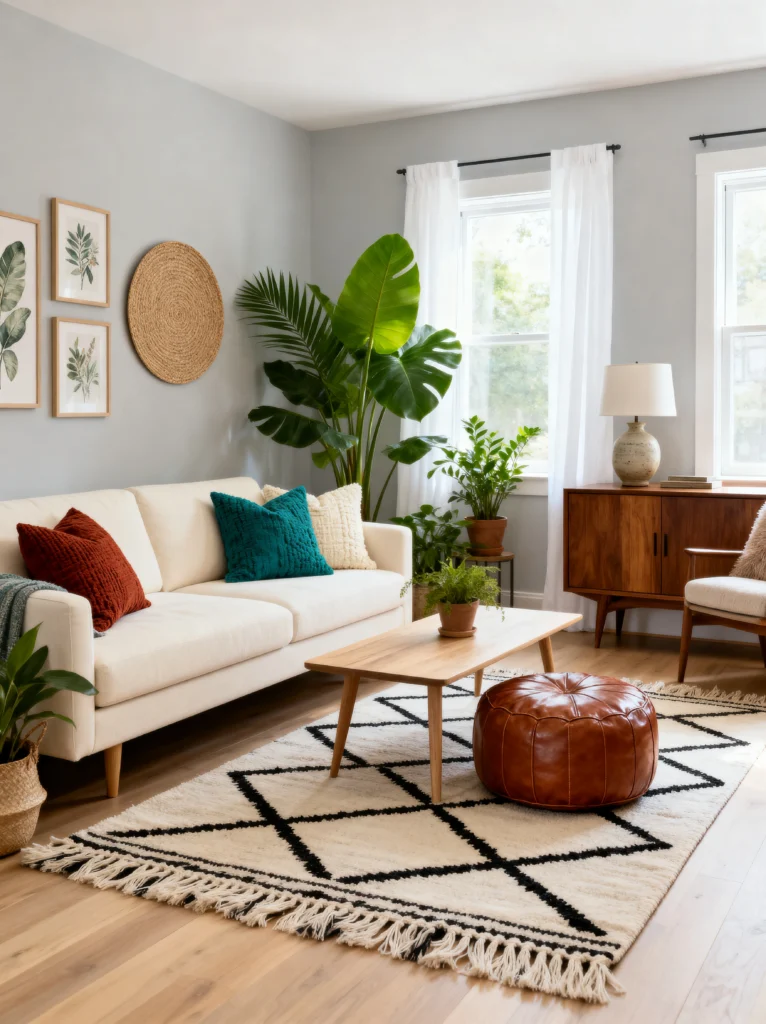 This room feels like a deep breath of fresh air. It’s got such a light, Scandi-boho energy that I’m obsessed with. The light grey walls are the perfect backdrop for all those natural textures—the jute wall hanging, the wooden sideboard, and that buttery leather pouf.