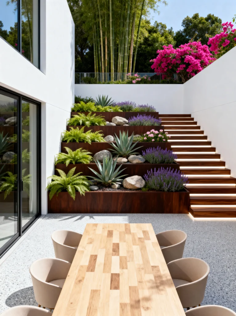Can we just take a second for this patio? If I had this in my backyard, you’d never see me inside again. Using tiered corten steel planters is such a genius way to handle a slope. It turns a boring retaining wall into a literal vertical garden.