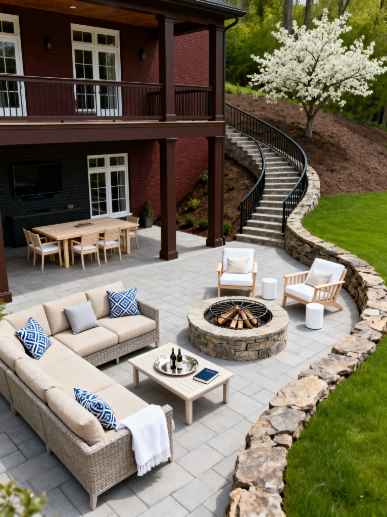 This is the ultimate setup for anyone who loves hosting. The way the stone retaining wall curves around the fire pit creates its own little “room” outdoors. It feels private and tucked away, even though it’s wide open.