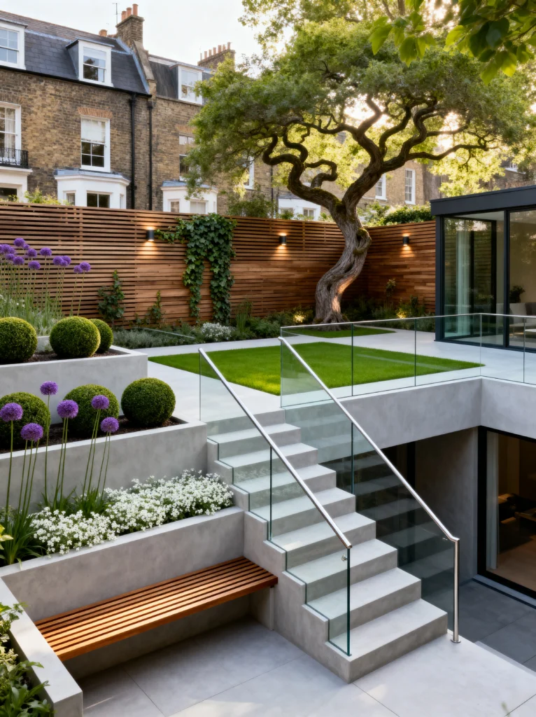 The glass railings on the stairs are a smart move because they don’t block the view of the garden below. It feels multi-dimensional and expensive. The mix of structured boxwood hedges and wilder purple flowers gives it a “manicured but natural” vibe that is just perfection.