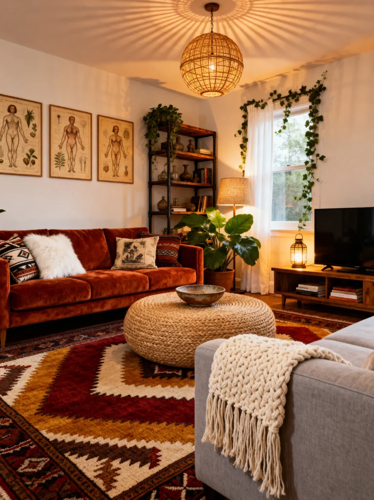 What really makes this room work is the layering of textures. We’ve got a massive jute ottoman in the center that adds a bit of a raw, organic touch, and that patterned rug pulls in all those mustard and burgundy shades perfectly. If you look at the walls, there’s this cool, vintage-scientific vibe with the anatomical sketches. It’s such a clever way to add personality without making the room feel like a museum. And can we talk about that pendant light? It casts these amazing radial shadows across the ceiling, which basically turns the lighting into art itself. It’s moody, it’s cozy, and I honestly never want to leave this couch.