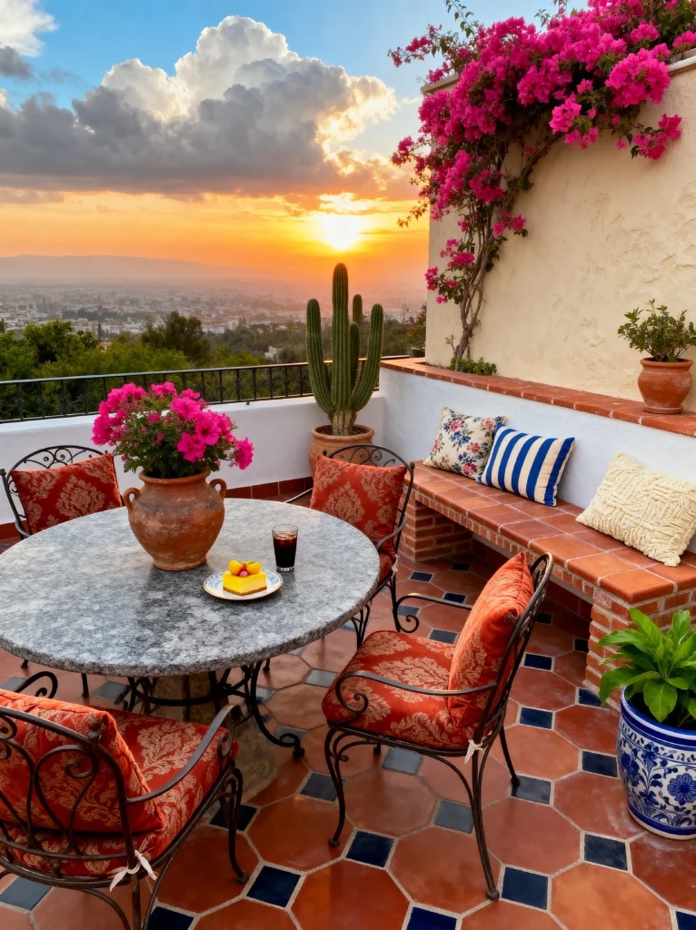 Look at this sunset, seriously! The sky is just on fire with all these beautiful orange and pink hues. I love how the city lights are just starting to twinkle below, it’s so peaceful. And this patio! The terracotta tiles and the wrought-iron furniture give it such a cozy, Mediterranean feel. That bougainvillea is a serious statement piece, it adds such a pop of vibrant color against the white-washed walls. Imagine sipping on a drink, maybe that iced coffee right there, and just watching the day turn to night. And can we talk about that cactus in the pot? It adds such a cool, desert vibe. The whole scene is just calling for a relaxing evening, maybe with some friends or a good book. I’m definitely taking notes on this one, I want my patio to feel this inviting.