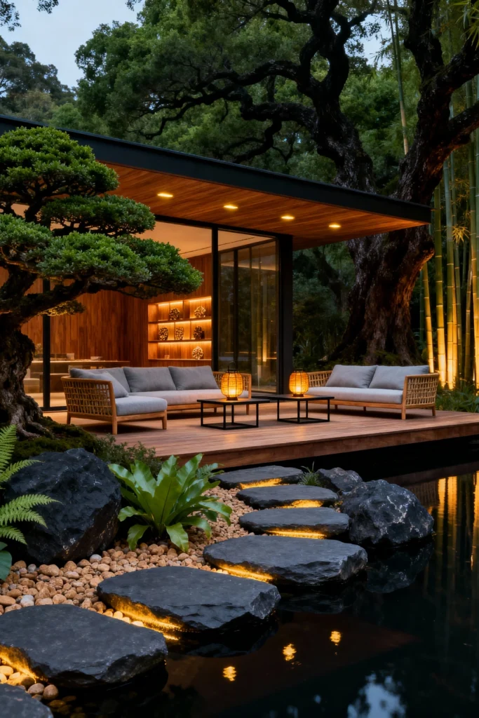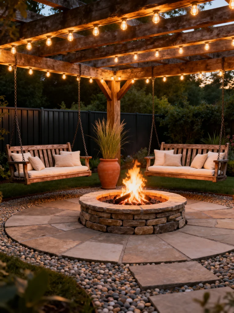 For a more relaxed, backyard vibe. I love the rustic feel of the wooden pergola with the large, decorative Edison bulbs. It creates a space that feels both cozy and welcoming. And those hanging swings! What a fun and unique seating option., the main focus is the fire pit. A circular, stone-paved fire pit area like this is perfect for gathering with friends. The built-in wooden benches around the fire create extra seating. You could also add some comfortable, large floor cushions. The potted tall grass adds a natural and rustic element. Imagine roasting marshmallows and sharing stories well into the night!