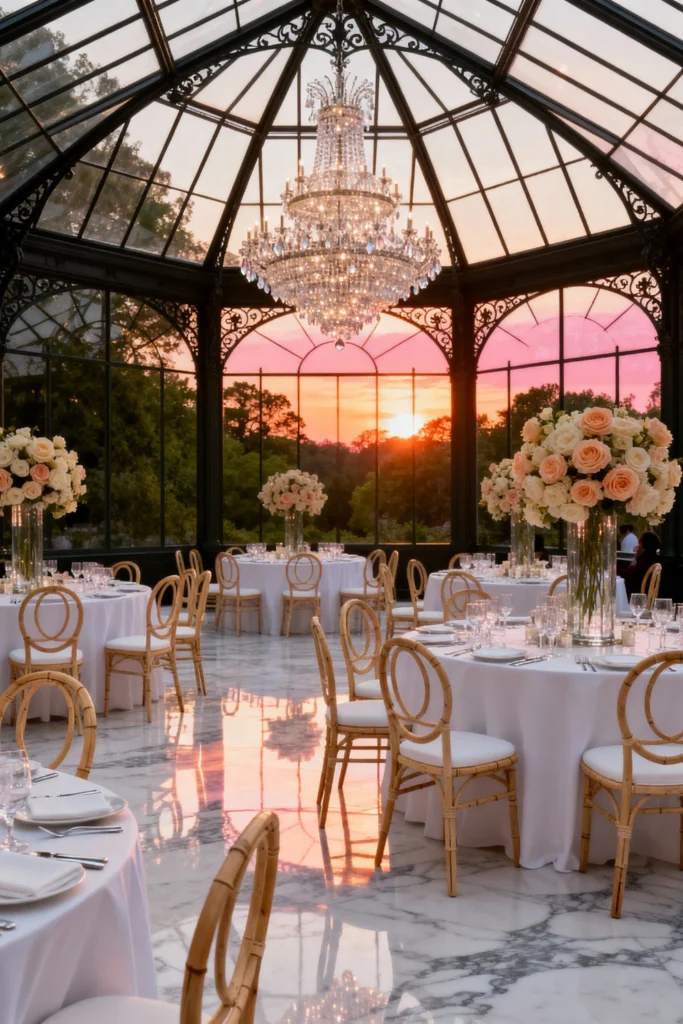 If your style is a bit more refined. This looks like a setting for an outdoor wedding or a sophisticated garden party. The large glass dome and the elaborate chandeliers are so grand! The marble floor adds another layer of elegance.you could create a miniature version of this in your own backyard. Start with a clear space for a dining table and cover it with a crisp white tablecloth. Then, add a beautiful floral centerpiece and some delicate, high-back rattan chairs. To add a touch of romance, drape some string lights from nearby trees. While you may not have a glass dome, a clear canopy can provide a similar feel while protecting your guests from the elements.