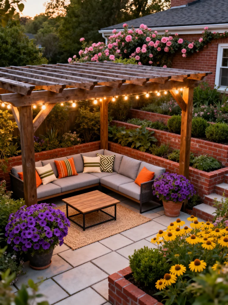 Finally, which is a beautifully terraced garden. The tiered, brick planters overflowing with lush greenery create so much depth and interest. The rustic wooden pergola with the string lights adds a warm and inviting feel.this is the perfect setup for a relaxing afternoon. Imagine a comfortable, L-shaped sectional couch with plenty of brightly colored pillows, just like you see here. The low, wooden coffee table is the ideal place to set your drink and snacks. Large pots of purple petunias and yellow black-eyed Susans provide splashes of color and attract bees and butterflies. It’s a wonderful place to soak in the sun and appreciate your beautiful garden.