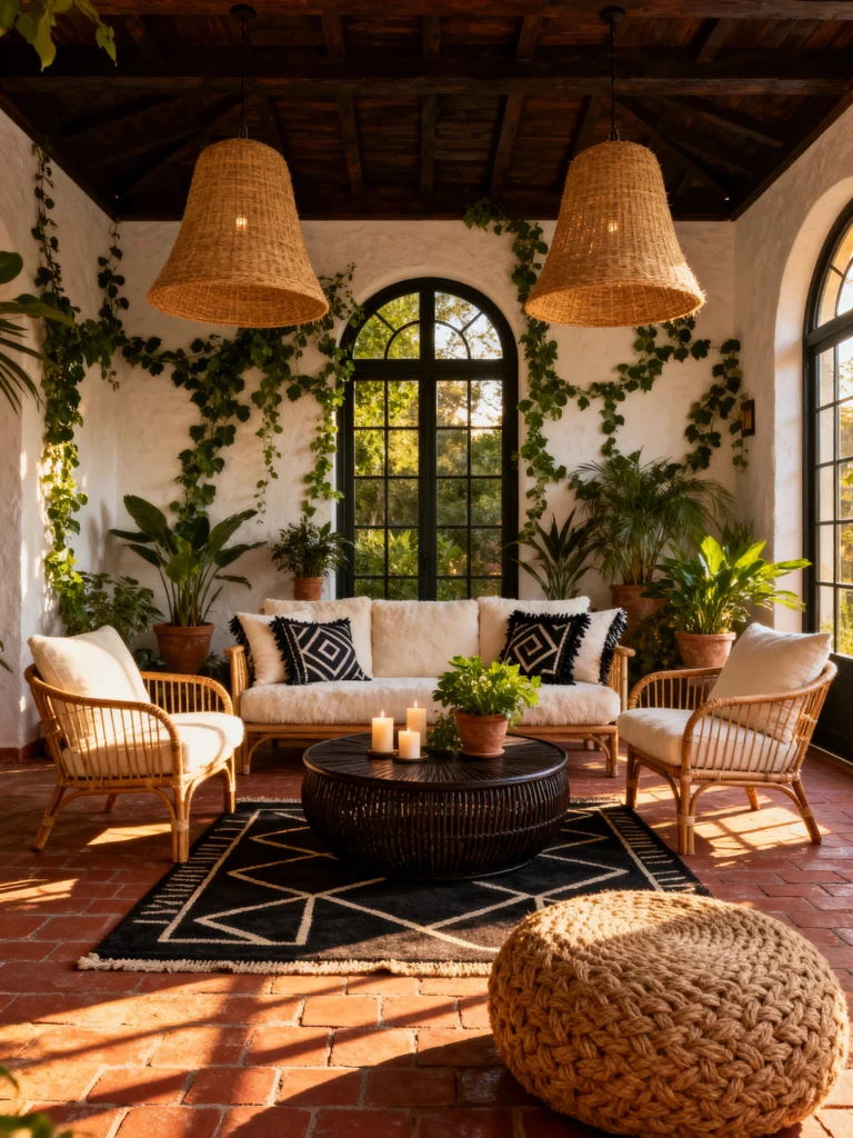 I am totally obsessed with this sunroom. It’s like stepping into a hidden jungle. The vines climbing the walls and all the potted plants are just gorgeous. And those huge arched windows? They’re just bathing the whole space in golden sunlight. I can practically feel the warmth. The rattan furniture gives it such a natural, earthy feel, and those white furry cushions look incredibly soft. I’d love to just curl up on that sofa with a good book, maybe with those candles lit for a cozy touch. The black coffee table and the patterned rug add a nice bit of contrast. I can definitely see myself spending hours in here, just surrounded by plants and sunlight. It’s like having a little slice of the outdoors inside. This is definitely my kind of sanctuary.
