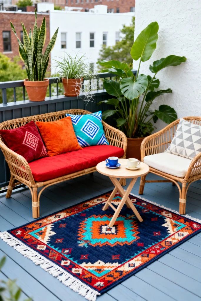 Check out this cool balcony setup! It’s amazing what you can do with a small outdoor space. I love the painted wooden deck and the blue railing, they give it such a vibrant, cheerful vibe. And that rattan furniture is perfect for relaxing, with all those colorful pillows. The red, orange, and blue pillows are just bursting with color, and that geometric pattern on the blue one is so eye-catching. It’s the perfect spot for a morning coffee or an afternoon tea. I can imagine just sitting there, enjoying the view and the fresh air. And all the plants on the railing and in the background add such a touch of green. This is definitely giving me some serious inspiration for my own small balcony. It just shows you don’t need a huge backyard to have a little outdoor oasis.
